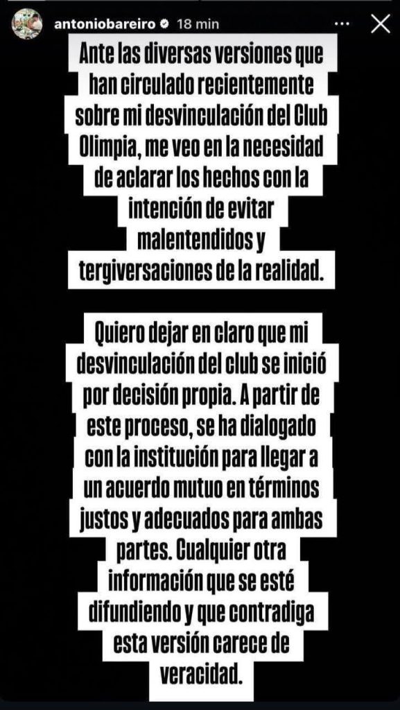 Luego de días de rumores y versiones cruzadas, Antonio Bareiro reapareció públicamente para aclarar su sorpresiva salida de Olimpia, club al que llegó a principios de año y en el que apenas estuvo 76 días.