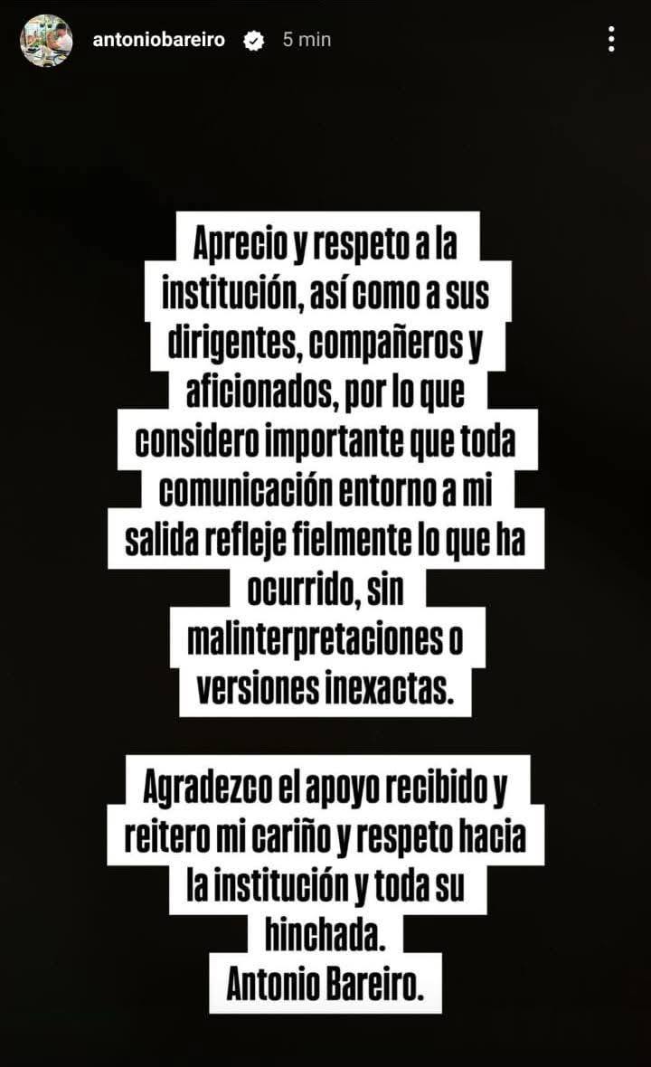 El ‘Demonio’ Bareiro, de 35 años, explicó que su intención al publicar el mensaje fue evitar malentendidos y aclarar que cualquier versión que contradiga lo que él explicó “carece de veracidad”.
