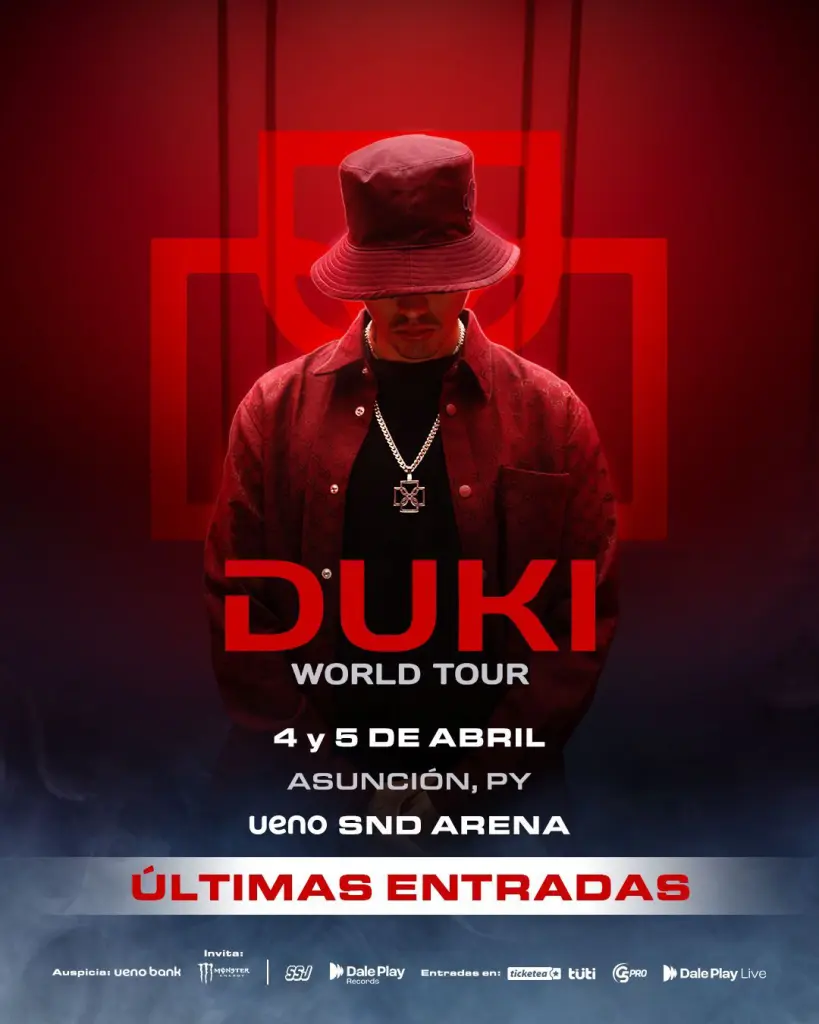 Ahora es el turno de Paraguay, donde el Duko se reencontrará con su gente para presentar temas de su último disco “AMERI”, así como himnos inolvidables como “Goteo”, “Givenchy”, “She Don’t Give a Fo”, “Malbec”, entre otros. Si alguna vez te imaginaste cantando a los gritos en un estadio lleno de energía, este es el momento.