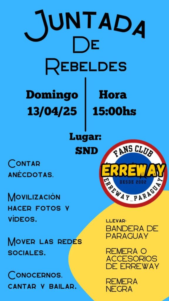 Este Domingo 13 de Abril a las 15hs, el Club de Fans de Erreway Paraguay organiza una gran Juntada Rebelde en la explanada de la Arena UENO SND, para demostrar que el grupo argentino aún tiene una legión de fieles que sueñan con verlos nuevamente en vivo en tierras guaraníes.