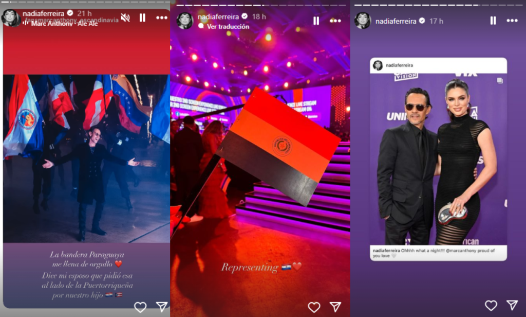En las siguientes historias, la pareja aparece elegante en la alfombra roja de los Latin American Music, donde Nadia porta la bandera paraguaya en señal de representación, apoyando a su esposo en sus proyectos y bailando durante la presentación.