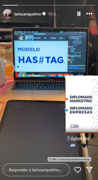 Lari mencionó que está a un año de convertirse en Licenciada en Ciencias de la Comunicación y además está realizando especialidades internacionales. En sus historias de Instagram, publicó y mostró una imagen de sus clases virtuales del Diplomado en Marketing y otro en Empresas, ambos en la UBA – Universidad de Buenos Aires.