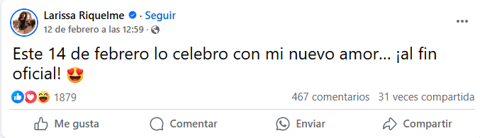 «Este 14 de febrero lo celebro con mi nuevo amor… ¡al fin oficial!», escribió Larissa, acompañado de un emoji de enamorada.