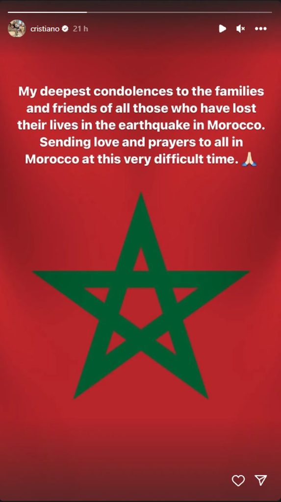 El futbolista también lanzó un mensaje para todos los afectados por esta triste tragedia. “Mis profundas condolencias a las familias y amigos de las víctimas del terremoto en Marruecos. Envío mi amor y plegarias a todos en Marruecos en estos tiempos difíciles”, agregando la bandera del país africano.